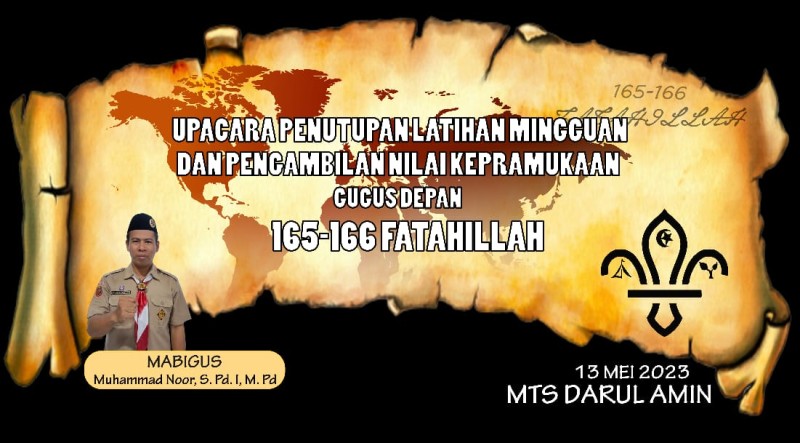 MTs Darul Amin kembali akan menyelenggarakan kegiatan pramuka dalam rangka penutupan dan penilaian akhir semester untuk ekstrakurikuler wajib kepramukaan bagi seluruh siswa kelas 7, 8, dan 9. Kegiatan ini akan diselenggarakan pada lapangan MTs Darul Amin, besok (13/05) dan turut mengundang Kwartir Cabang Kota Palangka Raya.